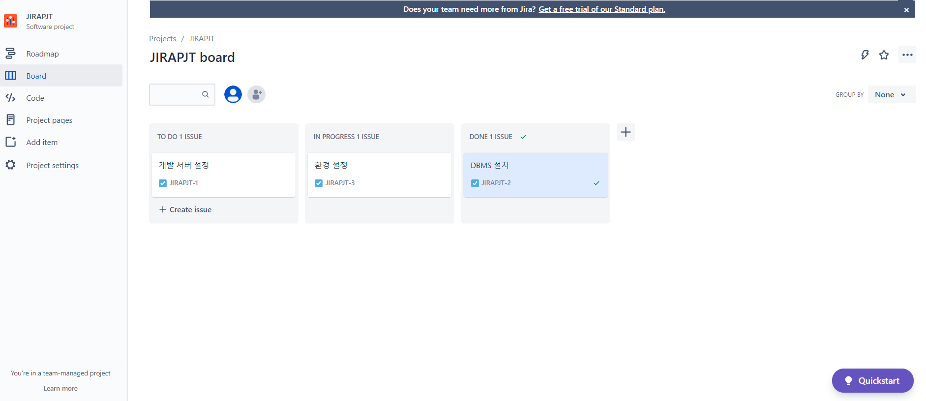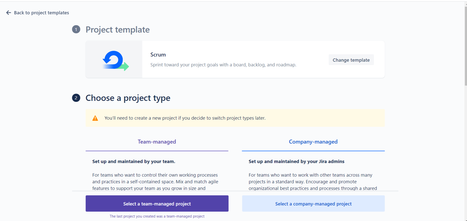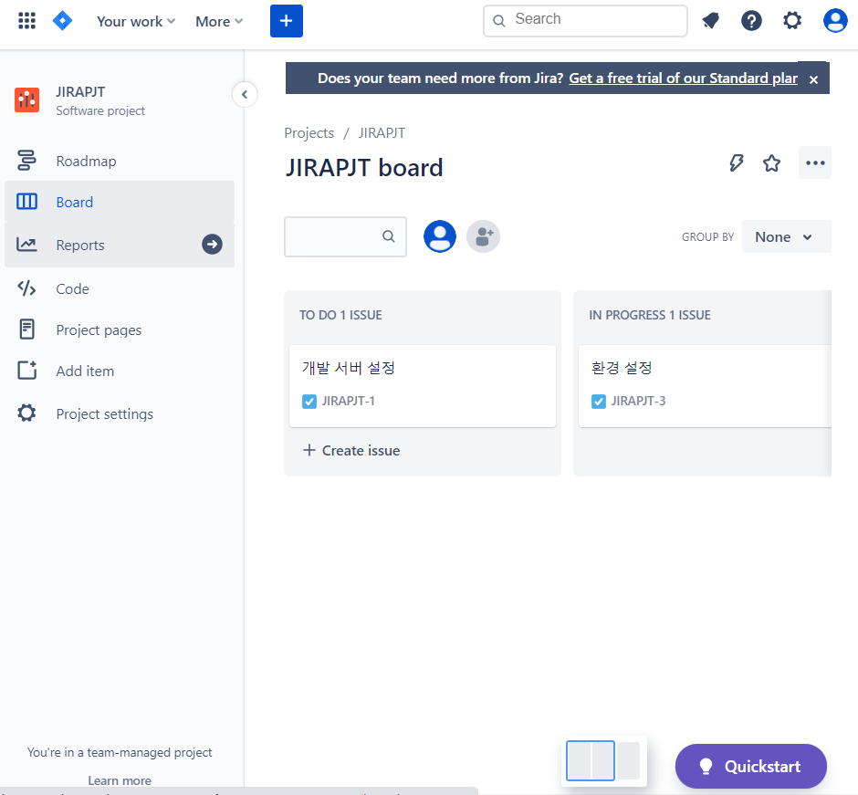 빠르게 시작하고 싶으면 team-managed 프로젝트를 선택