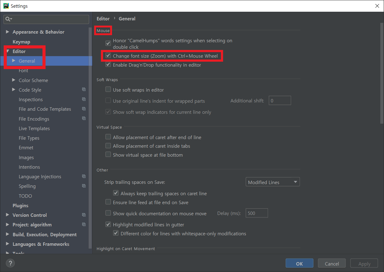 2. [Editor - General의 Mouse]로 이동하여 빨간색 박스란에 ✔ 체크표시를 해준다.