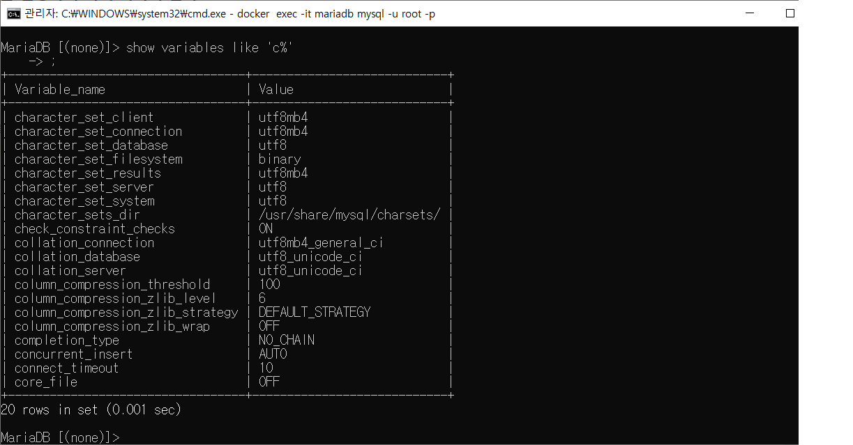 show variables like 'c%'; 또는 > status 로 바뀐 것 확인해주자.