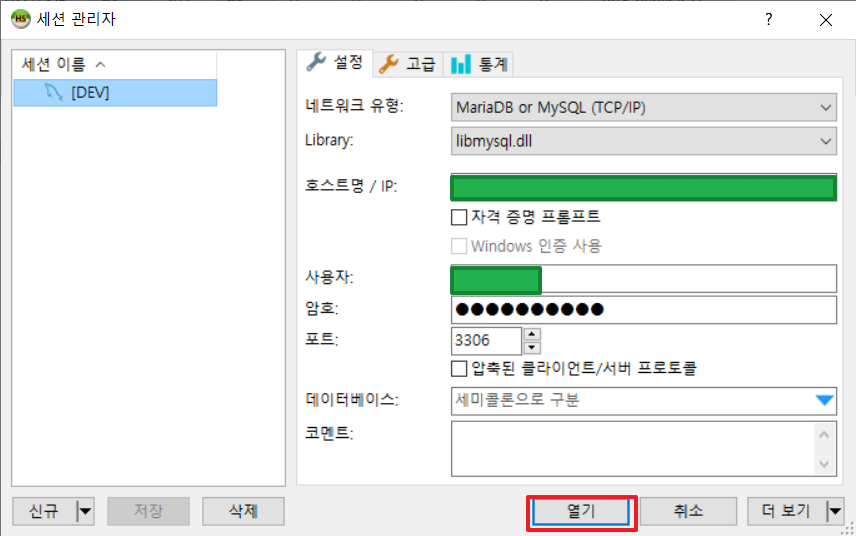 이번 이후에 HeidiSQL을 사용 할 땐 소괄호를 뺀 암호를 적어주면 된다.