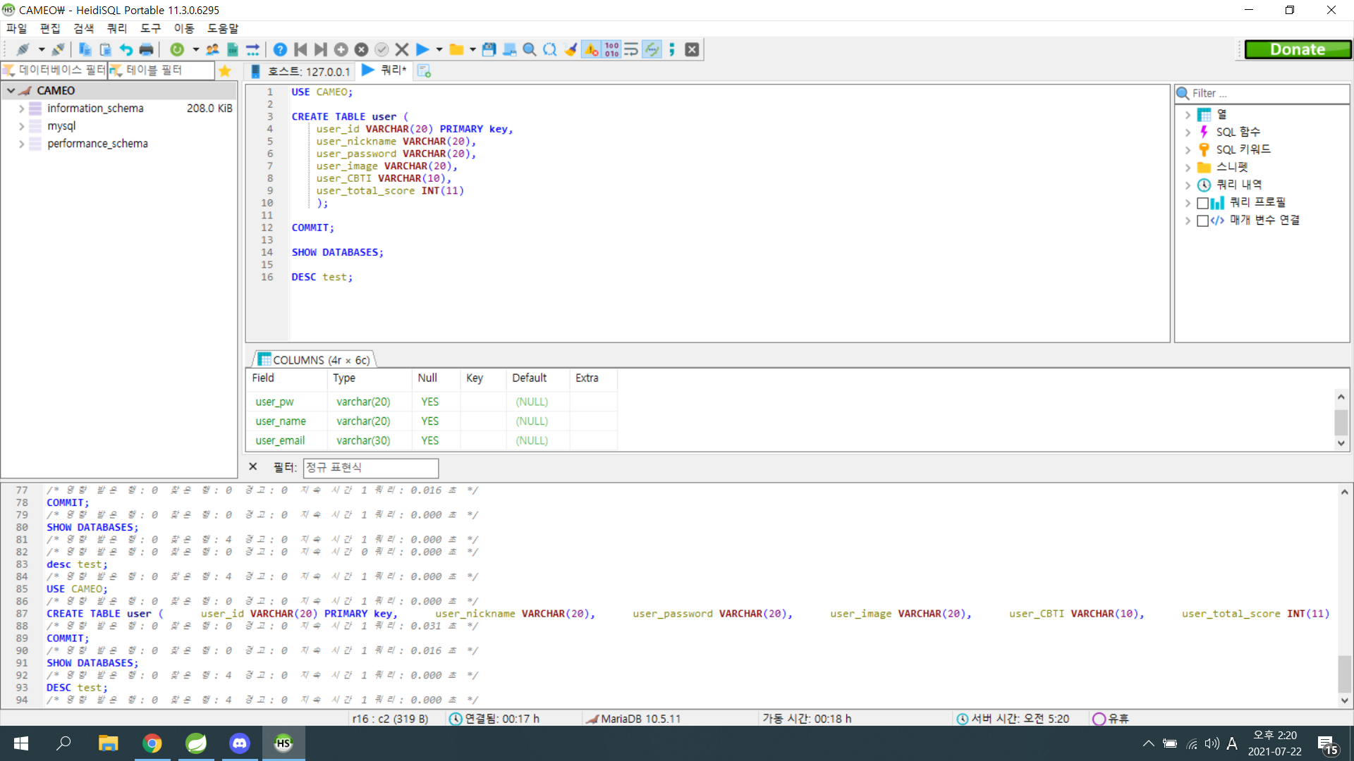 HeidiSQL을 통해 테이블을 만들어본 모습