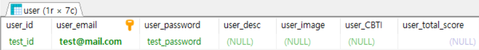 현재 나의 DB상태는 아래와 같고 나는 test@mail.com의 정보를 조회하고싶다.