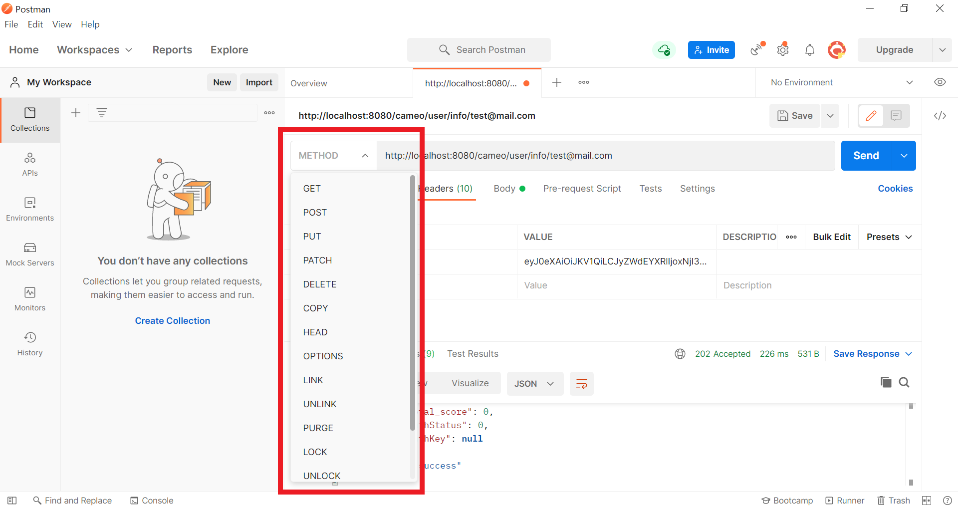@GetMapping("/info/{user_email}")해주었기 때문에 Postman에서 Send를 클릭해주기 전에 반드시 GET을 체크해주자.