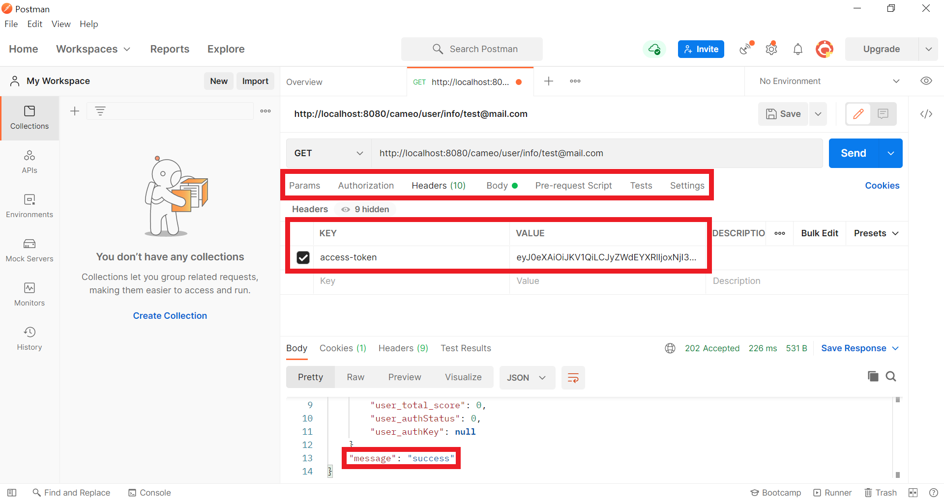 아래의 코드에 보다시피 getHeader("access-toekn")으로 설정해주었으니 Postman의 Headers란에 적어주자.