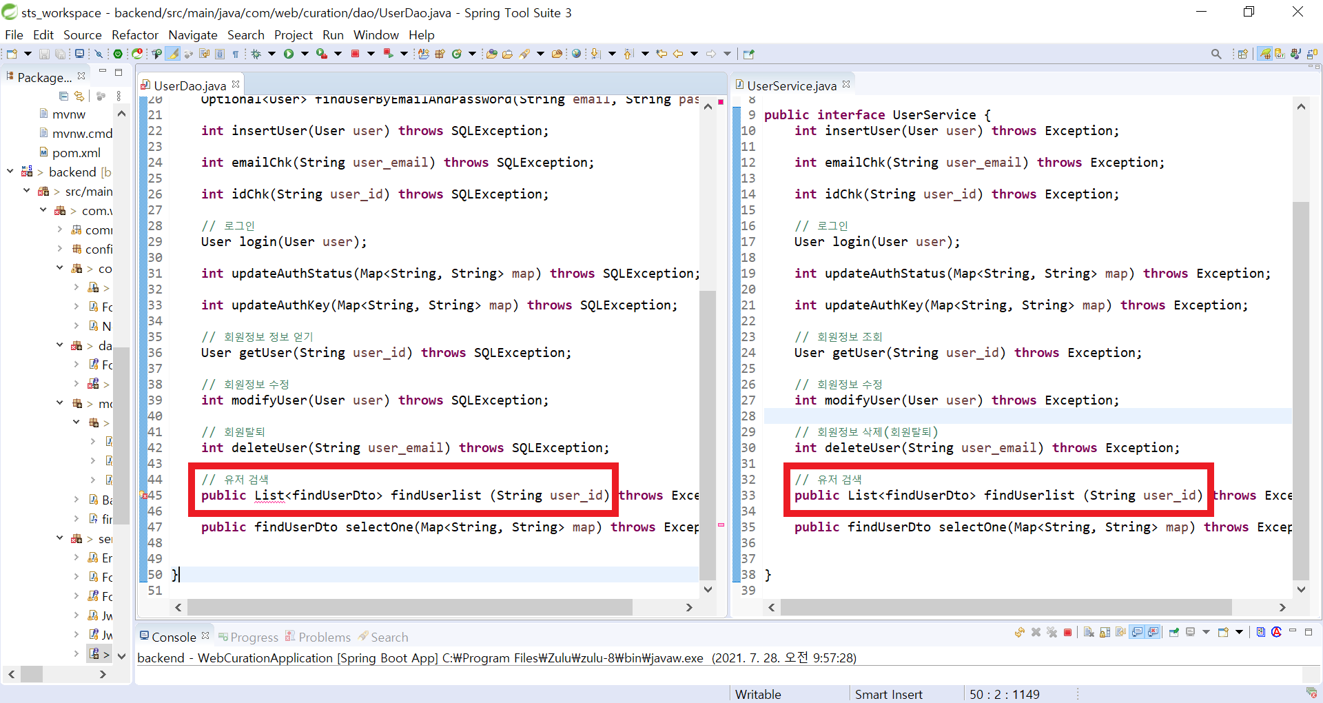 UserDao와 UserService를 비교해가며 기능을 만들어나가던 도중