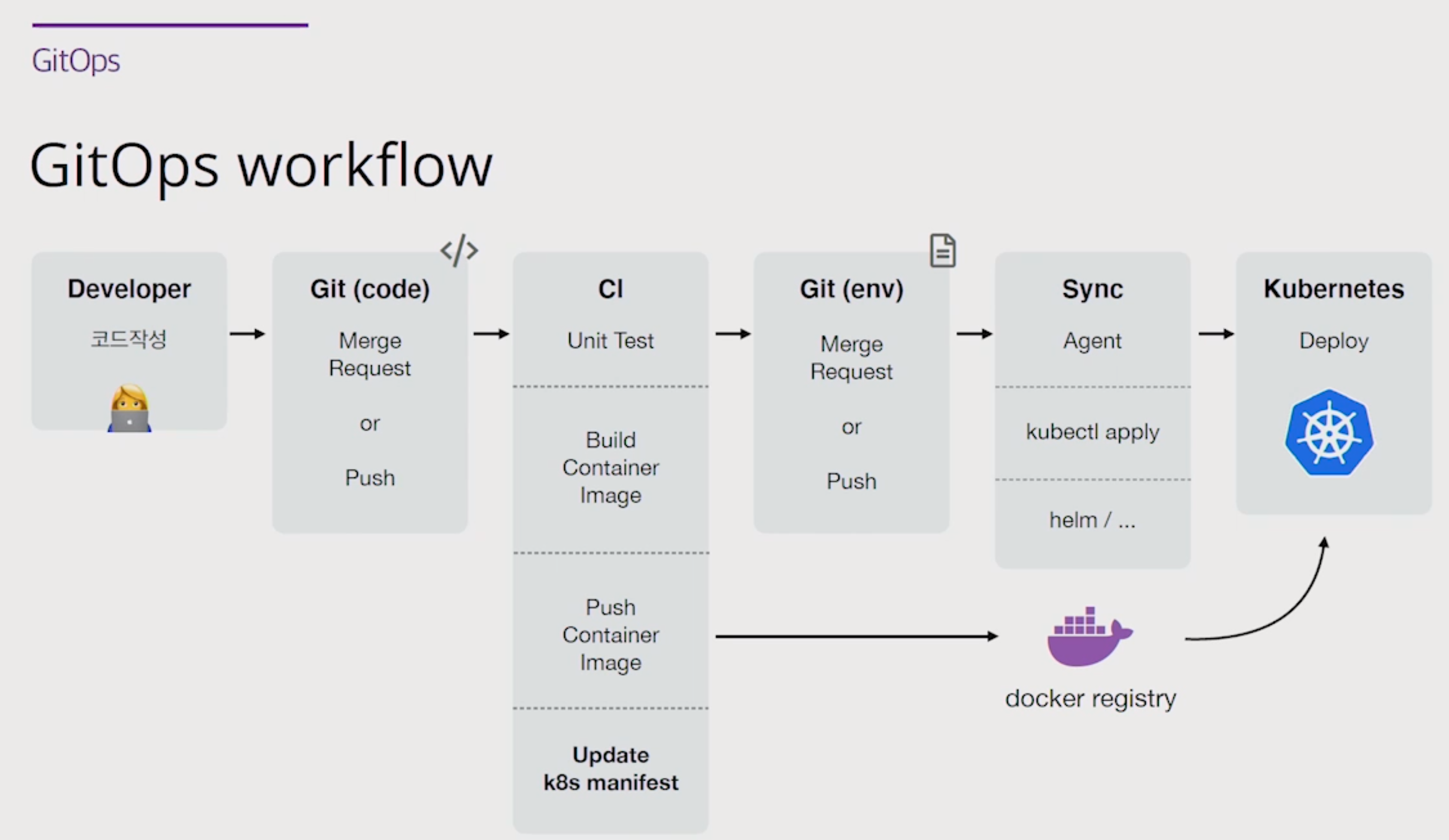 애플리케이션의 배포와 운영에 관련된 모든 요소를 코드화 하여 깃에서 관리(Ops)하는 것이 깃옵스의 핵심이며 주로 쿠버네티스와 연동해서 사용함.