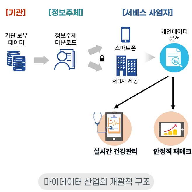 마이데이터 개념이 정립되면 소비자는 자신이 만들어낸 데이터의 주권을 행사할 수 있습니다. 금융 기업은 개인의 동의하에 데이터를 제공받아 맞춤형 자산 관리를 하 등 새로운 사업 모델을