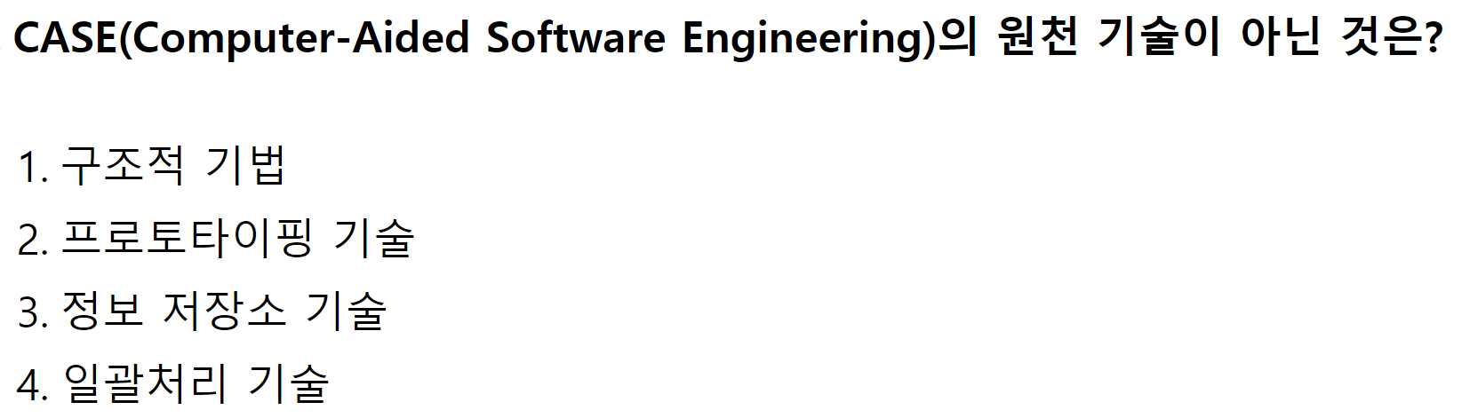 - 구조적 기법/프로토타이핑 기술/자동프로그래밍 기술/정보 저장소 기술/분산 처리 기술