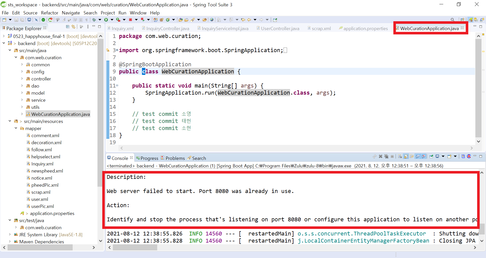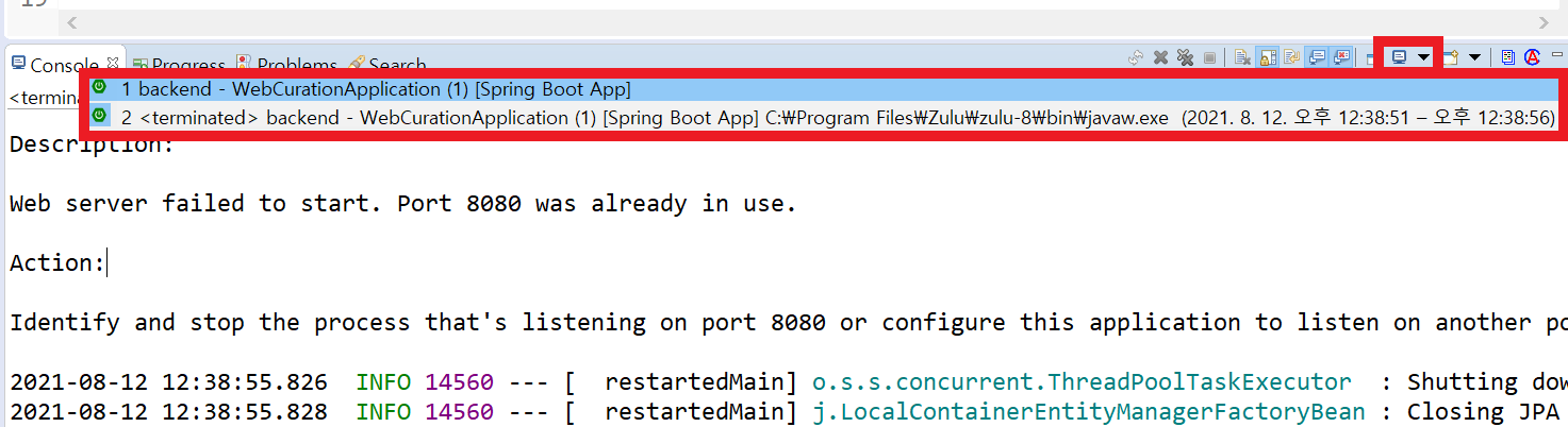 여러개가 실행되고 있다면 모두 중지시키고 다시 WebCurationApplication.java을 실행시키자!