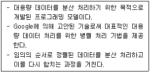 - 맵(Map) : 데이터가 텍스트 형태로 입력되면 64KB 분할한다. 텍스트 안에 단어를 분류하여 카운트한다.
