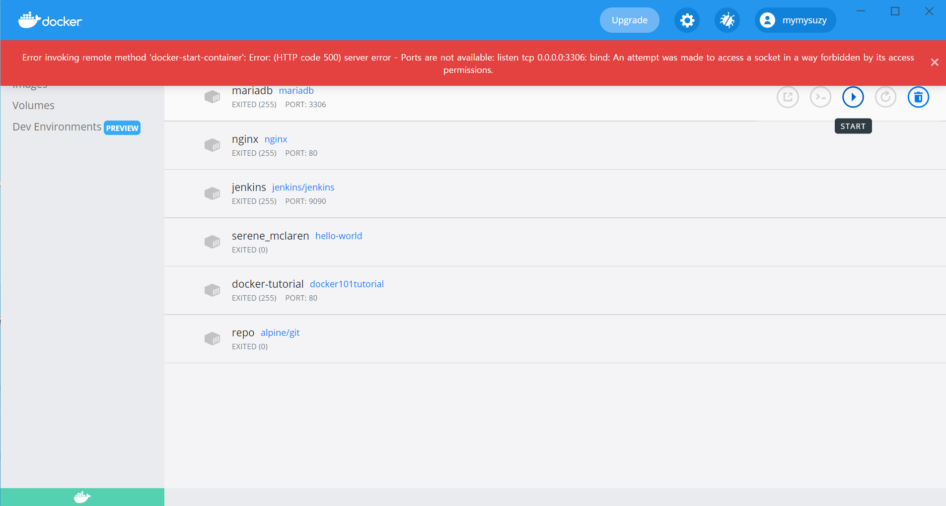 Error invoking remote method 'docker-start-container': Error: (HTTP code 500) server error - Ports are not available: listen tcp 0.0.0.0:3306: bind: An attempt was made to access a socket in a way forbidden by its access permissions.