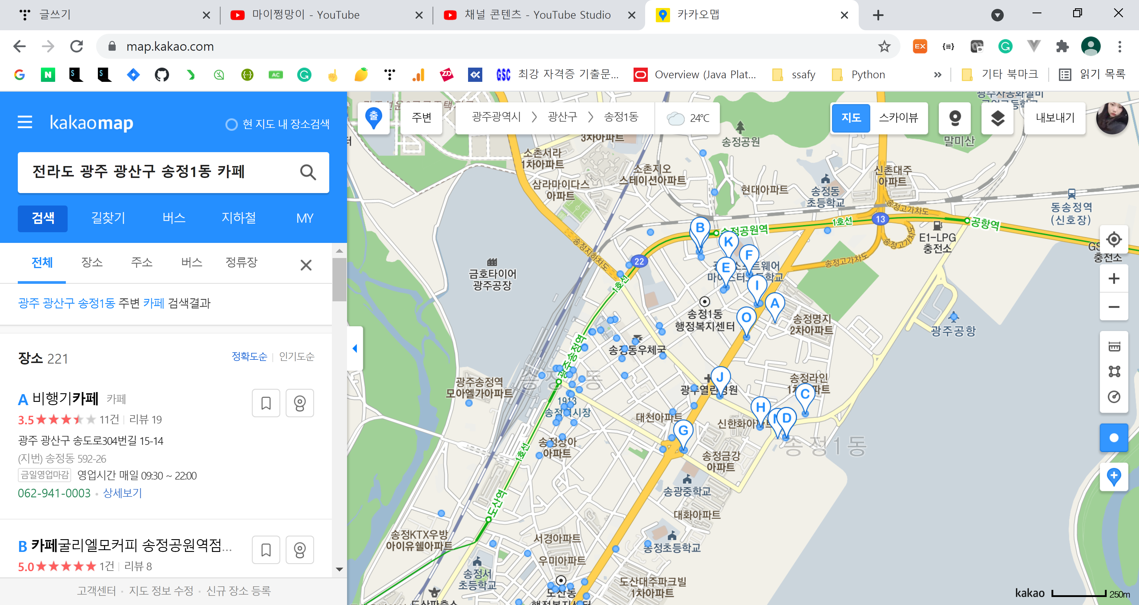 그래서 카카오맵에 '전라도 광주 광산구 송정1동 카페' 라고 검색한 화면에서 볼 수 있는