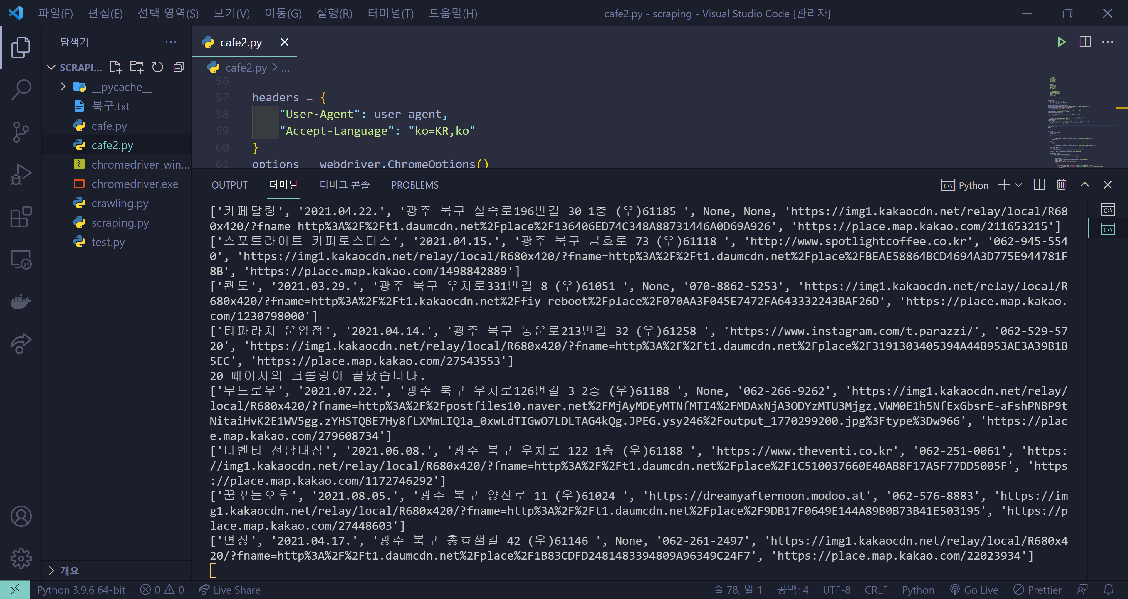 카페 이름, 주소, 전화번호, 이미지 등을 가지고 오는 스크래핑을 셀레니움(Selenium)을 통해 진행하고 있었다.