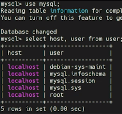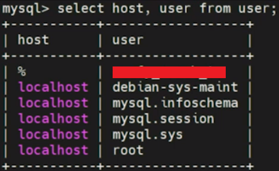 다시 MySQL의 기본유저 테이블 확인해보면 모든 ip에 대해서 접속을 허용하는 %가 호스트인 계정이 생성된 것을 확인할 수 있다.