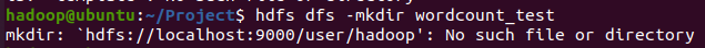실패했었던 하둡의 HDFS에 wordcount_test라는 디렉토리를 생성하는 명령어를 다시 시도해보자.