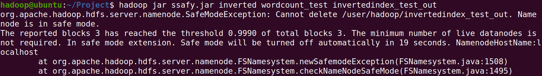 org.apache.hadoop.hdfs.server.namenode.SafeModeException: Cannot delete /user/hadoop/invertedindex_test_out. Name node is in safe mode. The reported blocks 3 has reached the threshold 0.9990 of total blocks 3. The minimum number of live datanodes is not required. In safe mode extension. Safe mode will be turned off automatically in 19 seconds. NamenodeHostName:localhost
