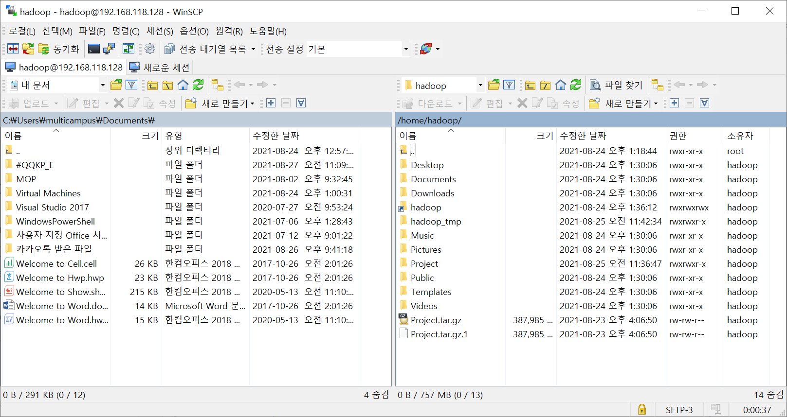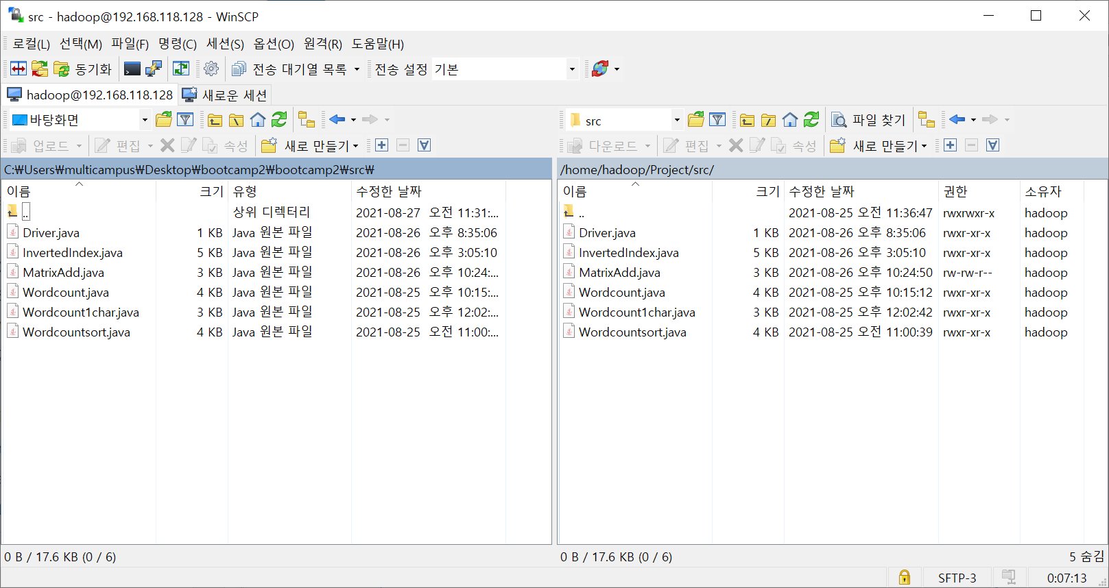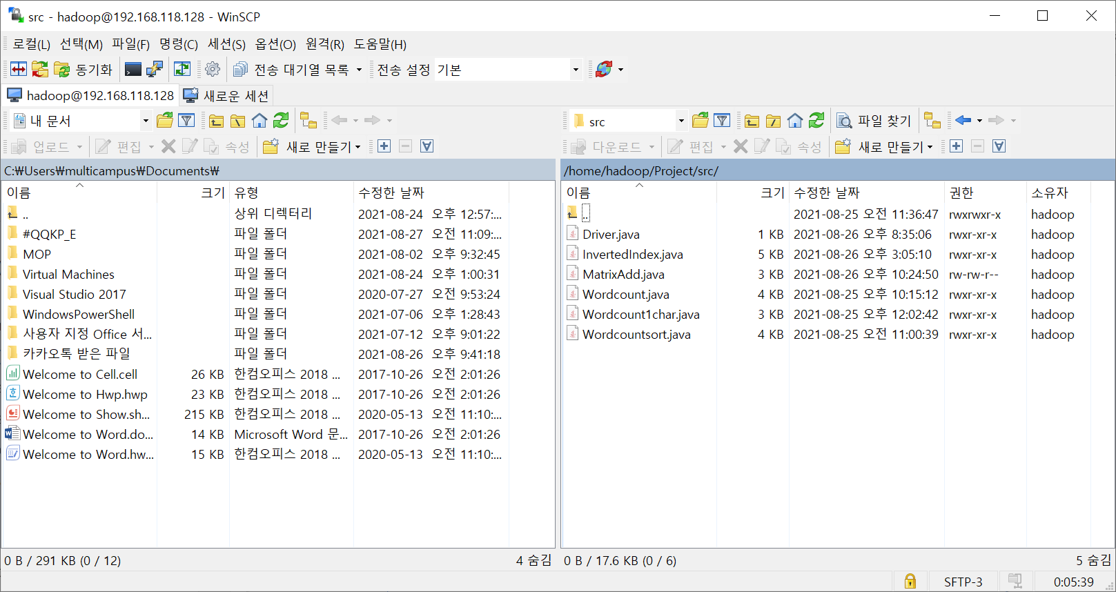 왼쪽의 윈도우창 역시 내가 원하는 경로로 이동시켜준 뒤, 리눅스에서 윈도우로 보내고 싶은 파일을 그대로 드래그 해주면 된다.
