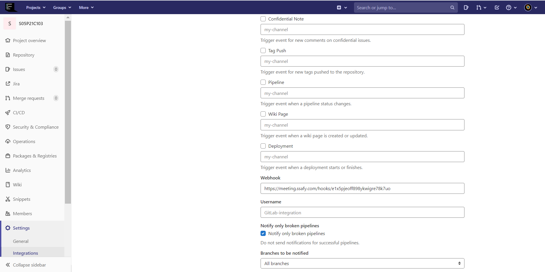 이로서 Gitlab에서 Mettermost notifications로 설정 완료.