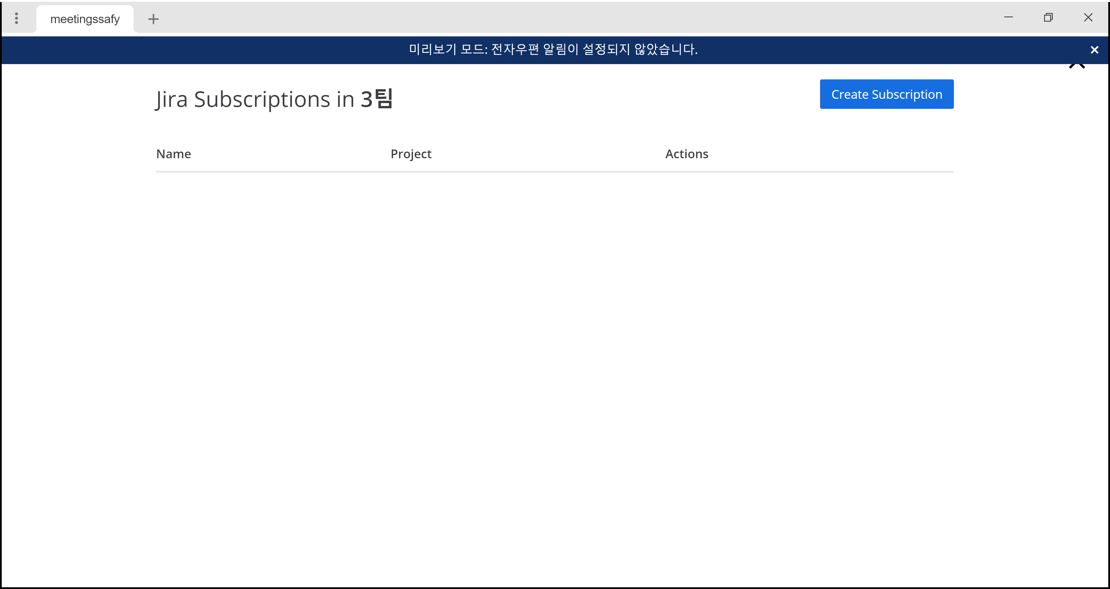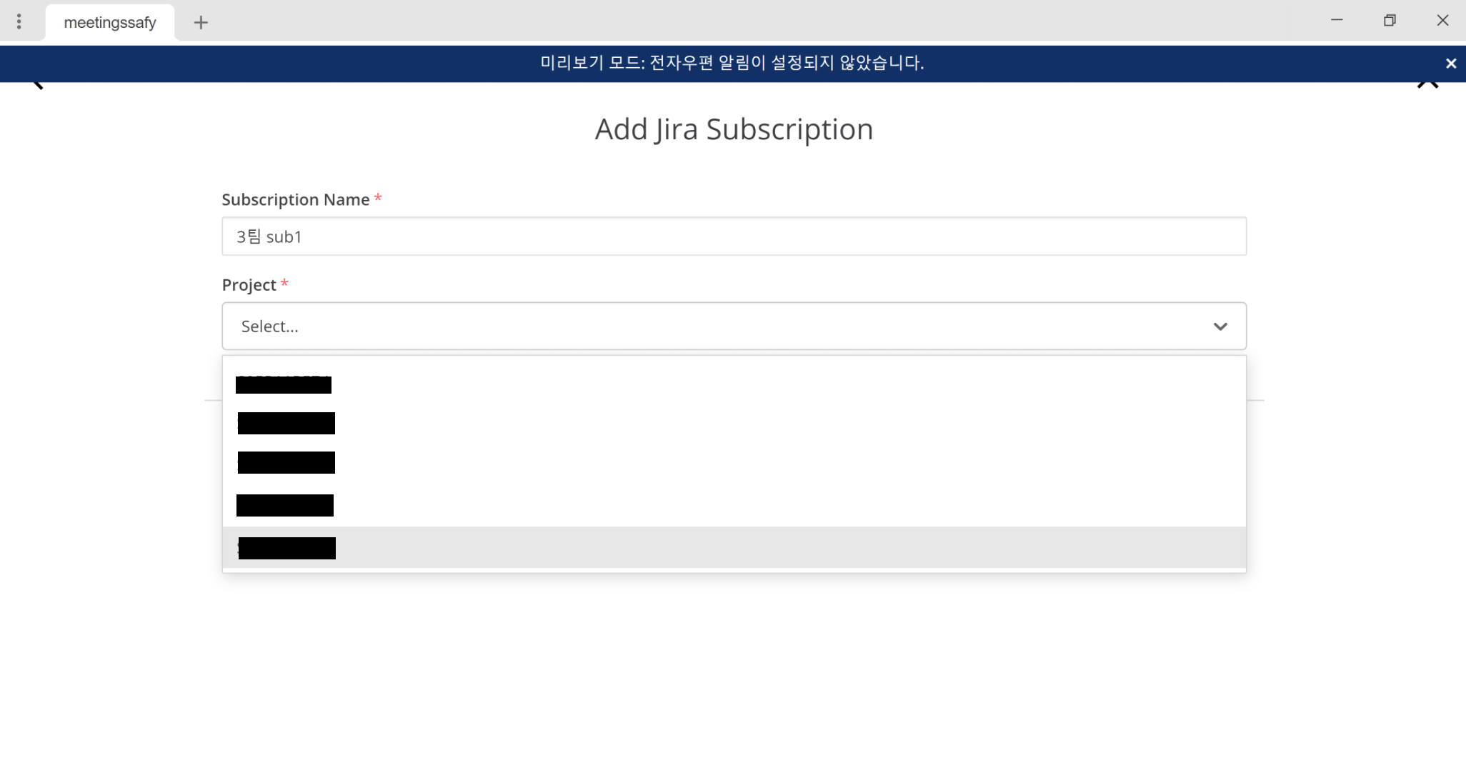 다시 채팅창에 /jira subscribe를 실행시켜주면 아래와 같은 창으로 넘어가진다.