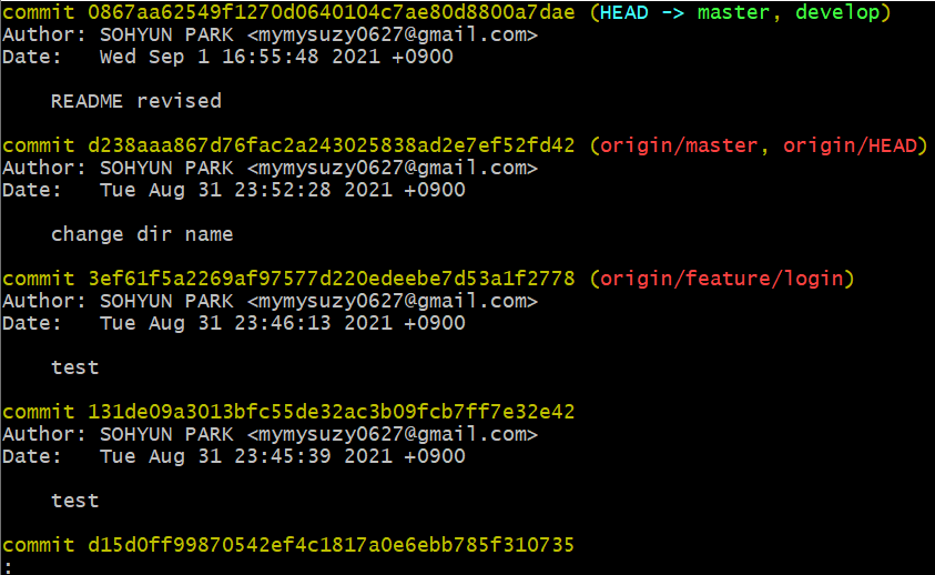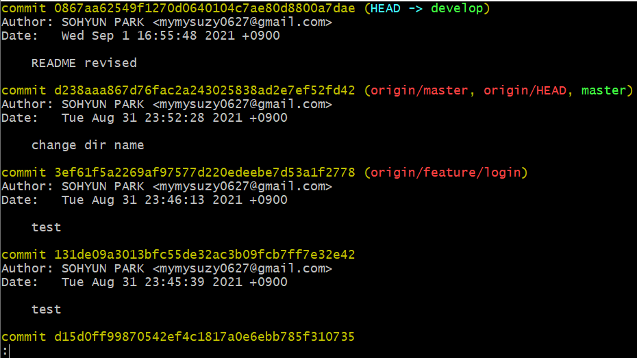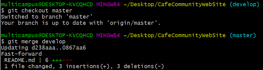 다시 로그를 찍어보면 head가 master와 develop 둘 다 수정된 내용을 가리키고 있는 모습을 볼 수 있다.