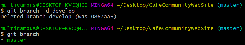 만약 병합이 끝나 사용할 필요가 없어진 브랜치라면 아래의 명령어로 브랜치 삭제를 진행해주자.