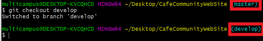 develop 브랜치로 head를 옮겨보자.(develop브랜치로 옮겨가보자.)
