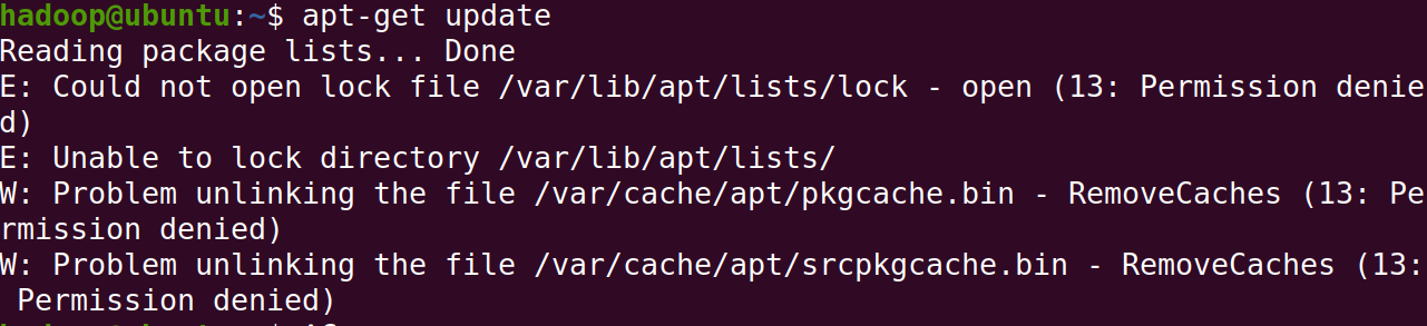 Reading package lists... Done E: Could not open lock file /var/lib/apt/lists/lock - open (13: Permission denied) E: Unable to lock directory /var/lib/apt/lists/ W: Problem unlinking the file /var/cache/apt/pkgcache.bin - RemoveCaches (13: Permission denied) W: Problem unlinking the file /var/cache/apt/srcpkgcache.bin - RemoveCaches (13: Permission denied)