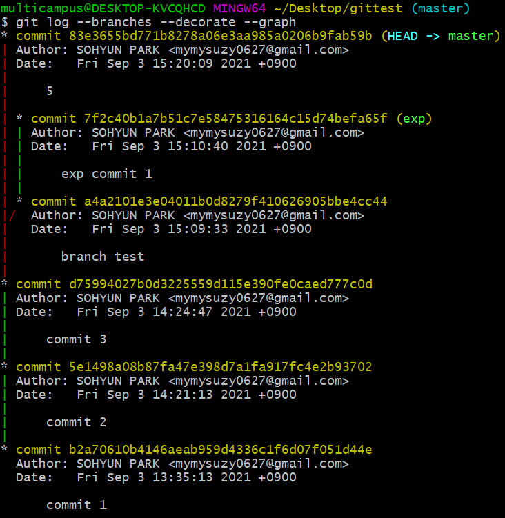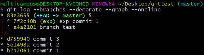 가정: 두 개의 브랜치 master와 exp가 다른 commit 내역을 가지고 있을 때