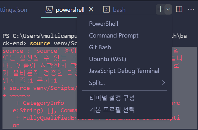 source : 'source' 용어가 cmdlet, 함수, 스크립트 파일 또는 실행할 수 있는 프로그램 이름으로 인식되지 않습니다. 이름이 정확한지 확인하고 경로가 포함된 경우 경로 가 올바른지 검증한 다음 다시 시도하십시오. 위치 줄:1 문자:1 + source venv/Scripts/Activate.ps1 + ~~~~~~ + CategoryInfo : ObjectNotFound: (sourc e:String) [], CommandNotFoundException + FullyQualifiedErrorId : CommandNotFoundExcepti on