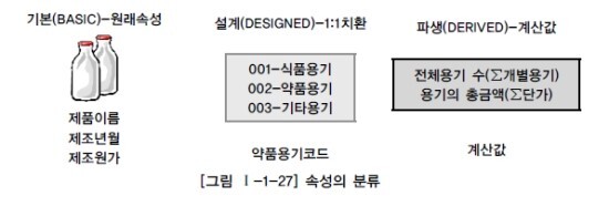 - 설계속성 : 업무상 필요한 데이터 이외에 데이터 모델링을 위해, 업무를 규칙화하기 위해 속성을 새로 만들거나 변형하여 정의하는 속성이다. 대개 코드성 속성은 원래 속성을 업무상 필요에 의해 변형하여 만든 설계속성이고 일련번호와 같은 속성은 단일(Unique)한 식별자를 부여하기 위해 모델 상에서 새로 정의하는 설계속성이다.