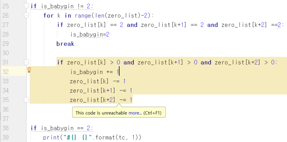 아래와 같이 노랗게 블록이 설정되며, This code is unreachable. 이라고 떴다.