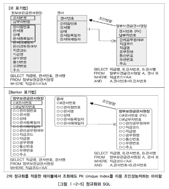 그림 Ⅰ-2-5에서와 같이 왼쪽 테이블에서는 불필요하게 납부자 번호만큼 누적된 데이터를 읽어서 결과를 구분하여 보여주어야 하지만 오른쪽은 관서수만큼만 존재하는 데이터를 읽어 곧바로 결과를 보여주기 때문이다. 이렇게 단순한 예만 보아도 정규화를 수행하면 무조건 조회 성능이 저하된다는 고정관념이 틀렸다는 것을 알 수 있다.