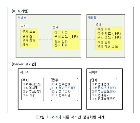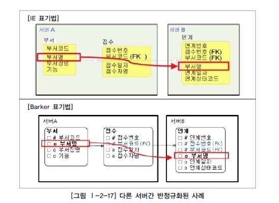 그림 Ⅰ-2-16은 데이터베이스 서버가 분리되어 분산 데이터베이스가 구성되어 있을 때 반정규화를 통해 성능을 향상할 수 있는 경우이다.
