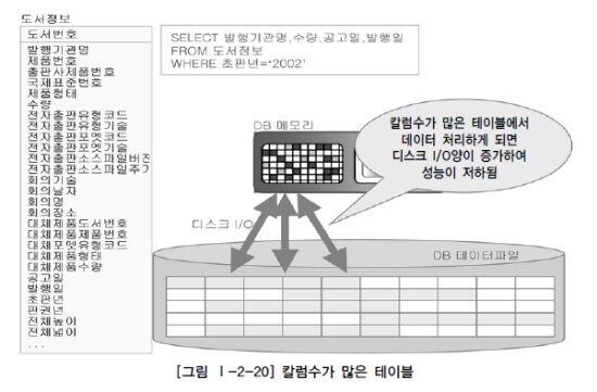 - 하나의 테이블에 여러개의 컬럼 존재 : 디스크의 점유량이 높아지고 데이터를 읽는 I/O량이 많아져서 성능이 저하된다.