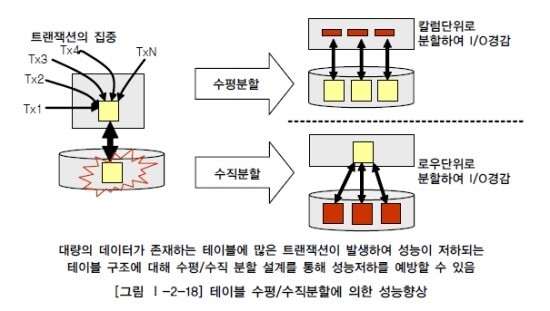 - 수평분할 : 컬럼 단위로 분할하여 I/O(Input/Output) 경감