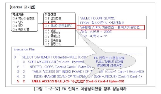 -> 비록 물리적으로 학사기준과 수강신청이 연결되어 있지 않다고 하더라도 학사기준으로부터 상속받은 FK에 대해 FK 인덱스를 생성함으로써 SQL문장이 조인이 발생할 때 성능저하를 예방할 수 있다.