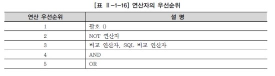 예제에서 “소속팀 코드가 삼성블루윙즈(K02) 이거나 전남드래곤즈(K07)”라는 조건을 만족하고 “포지션이 미드필더(MF)”인 조건을 동시에 만족해야 하는데, 위의 SQL 문장에서는 괄호가 누락됨으로서 OR 논리 연산자보다 AND 논리 연산자를 먼저 실행하기 때문에 잘못된 결과를 나타낸 것이다.
