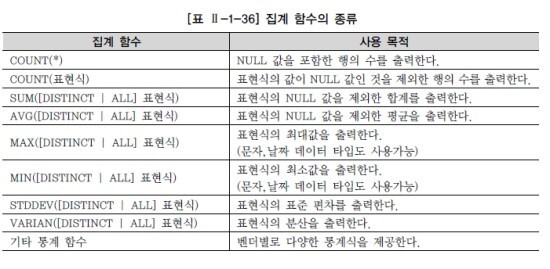 - 집계 함수의 통계 정보는 NULL 값을 가진 행을 제외하고 수행