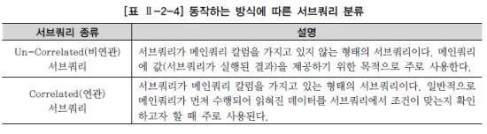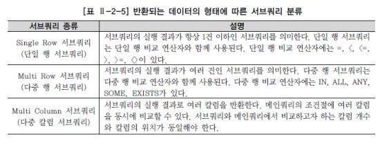 반환되는 데이터의 형태에 따라 서브쿼리 분류