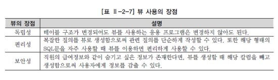 테이블은 실제로 데이터를 가지고 있는 반면, 뷰(View)는 실제 데이터를 가지고 있지 않다. 뷰는 단지 뷰 정의(View Definition)만을 가지고 있다. 질의에서 뷰가 사용되면 뷰 정의를 참조해서 DBMS 내부적으로 질의를 재작성(Rewrite)하여 질의를 수행한다. 뷰는 실제 데이터를 가지고 있지 않지만 테이블이 수행하는 역할을 수행하기 때문에 가상 테이블(Virtual Table)이라고도 한다. 뷰는 표 Ⅱ-2-7과 같은 장점을 갖는다.