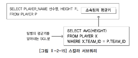 선수 정보와 해당 선수가 속한 팀의 평균 키를 함께 출력하는 예제로 스칼라 서브쿼리를 설명하면 다음과 같다.