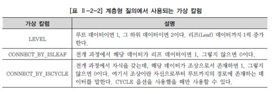 - 테이블에 계층형 데이터가 존재하는 경우 데이터를 조회하기 위한 방법.