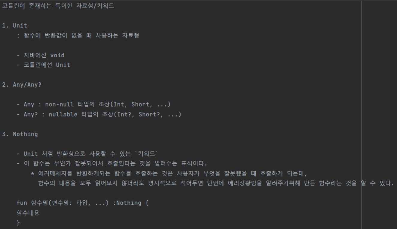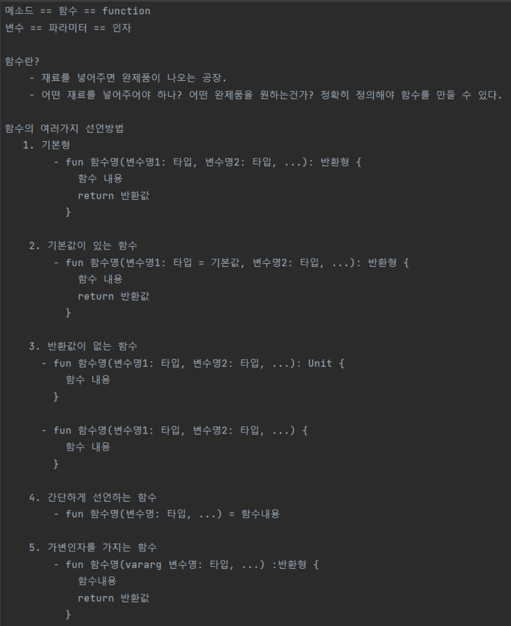 fun plusMultipleNums(vararg numbers: Int): Unit { // `반환값이 없고` 오로지 `출력`만 하는 함수이기 때문에 Unit을 적어줘야 한다!!