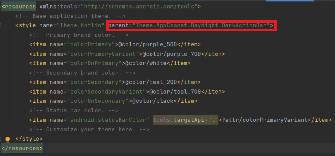 values폴더 - themes폴더 - themes.xml파일의 parent부분을 아래와 같이 바꾸어준다.