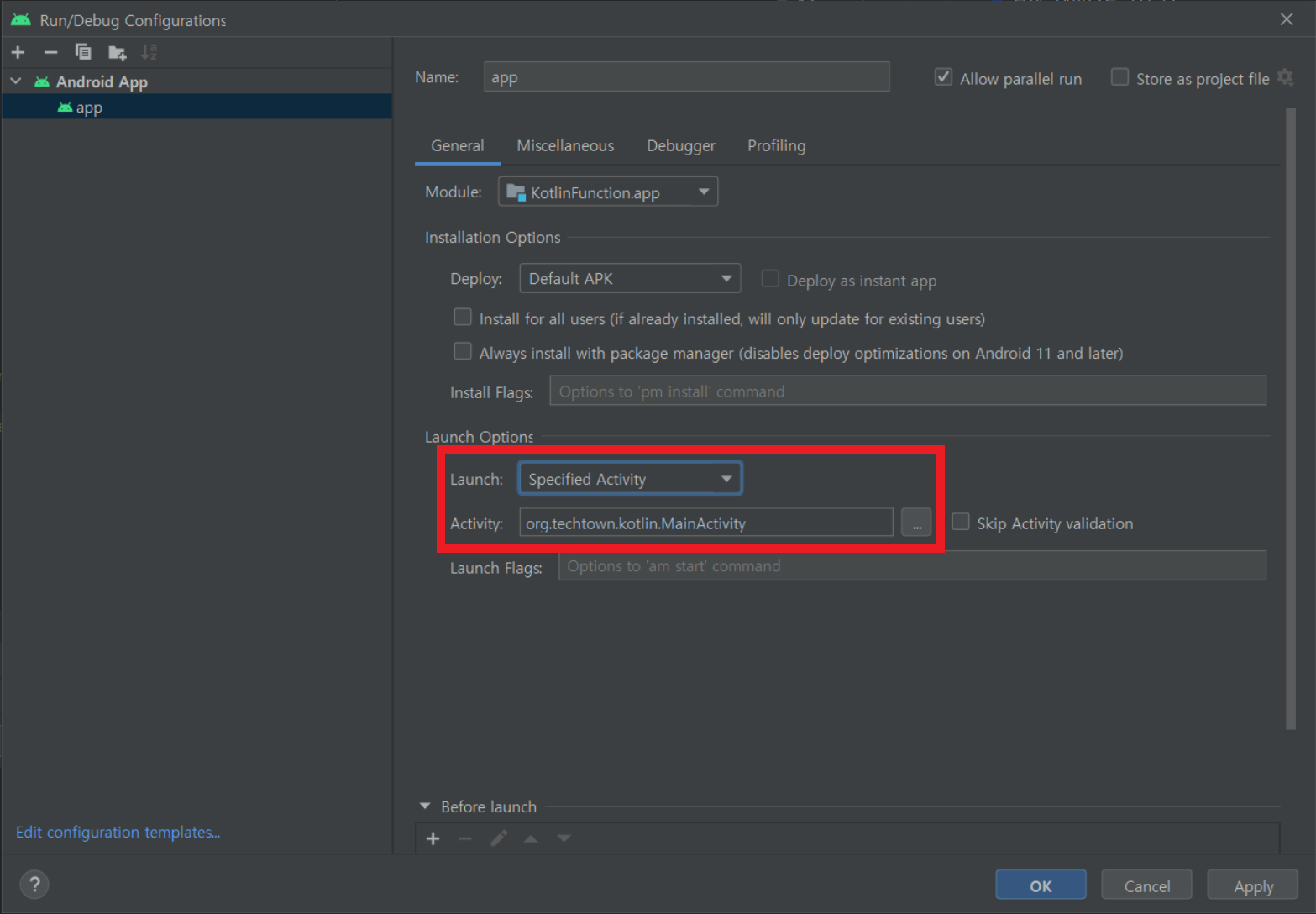 [Launch Options] - [Launch] - [Specified Activity] 클릭 - [Activity]에서 내가 돌리고싶은 xml파일 선택!!
