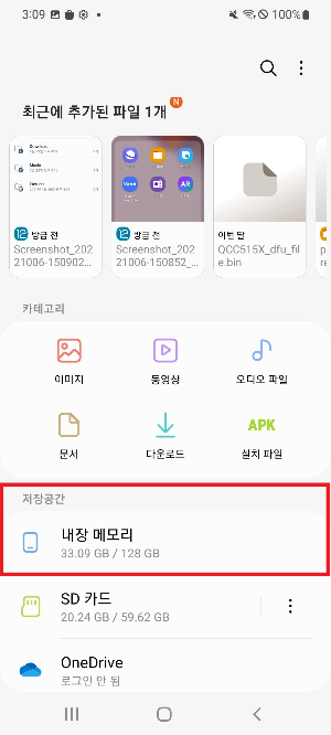 안드로이드 폰의 [내 파일] 어플에 들어가면 [저장공간]이 쭉 나온다.