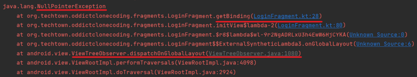 - 처음 이 에러를 맞닥드렸을 땐 제일 첫 번째 줄에 getBinding이 보여서, binding이 되지 않은건가? 하고 생각했었다.